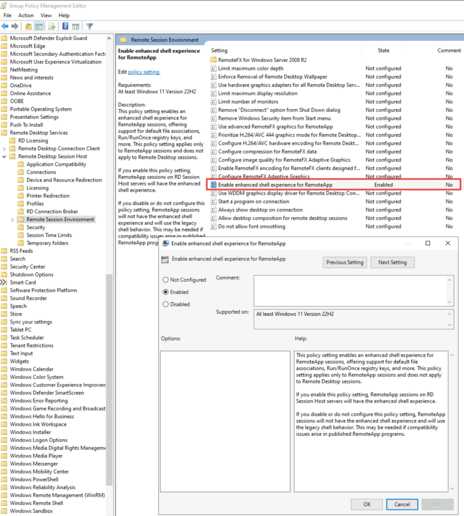 To enable enhanced shell experience for RemoteApps, you need access to a special ADMX template that is not included in the standard Microsoft ADMX downloads.