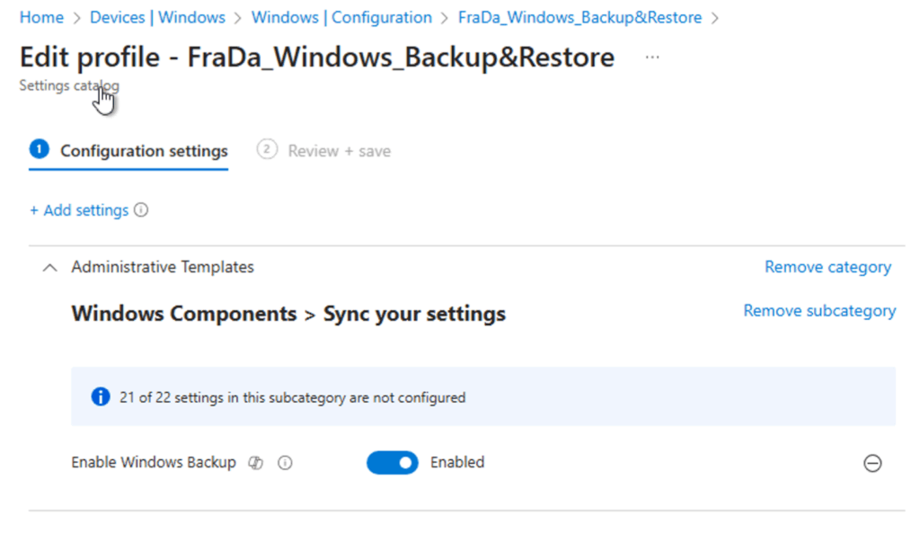 In Intune, go to Devices > Windows > Configuration Profiles and create a new profile using the Settings Catalog. - Search for “Windows Backup”