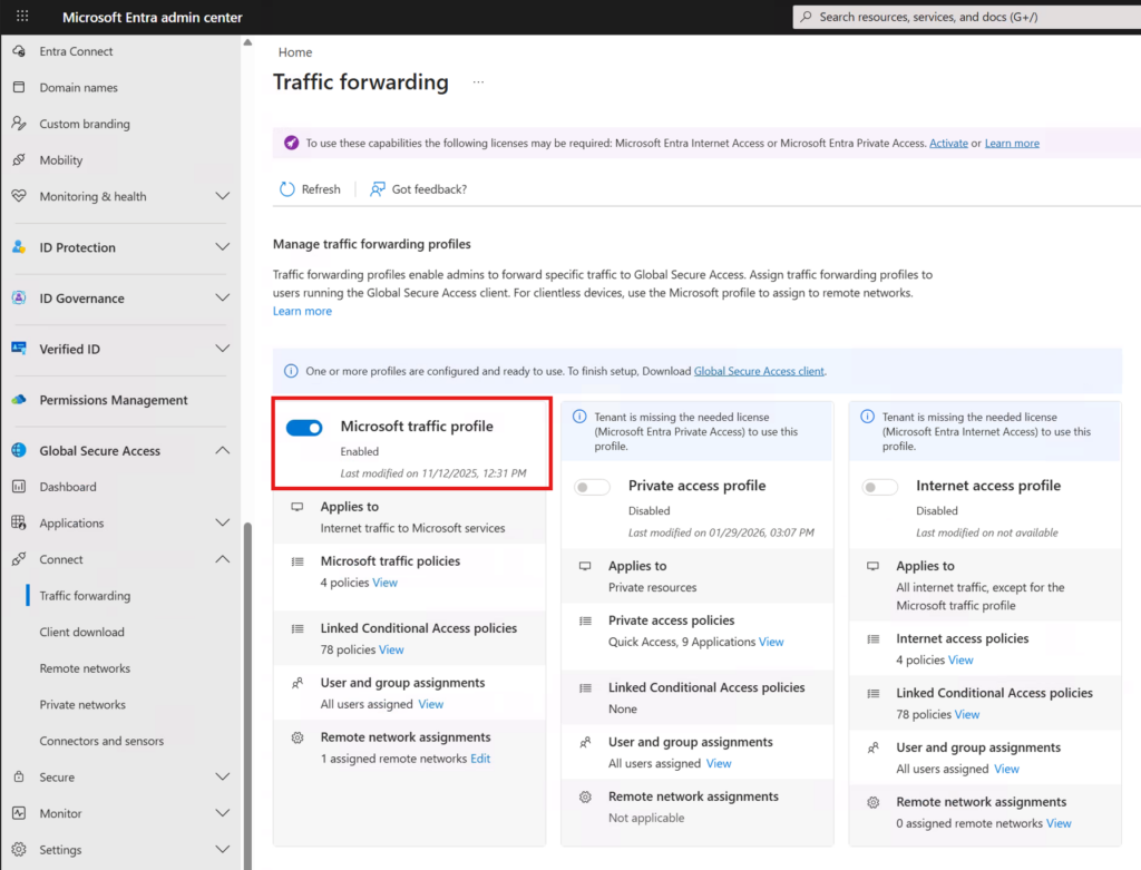 If your organization already operates on P1 (which most do), Global Secure Access for Microsoft traffic — including Compliant Network — is immediately available. And if you’re running P2, you’re covered as well, along with the additional identity governance features that license brings.