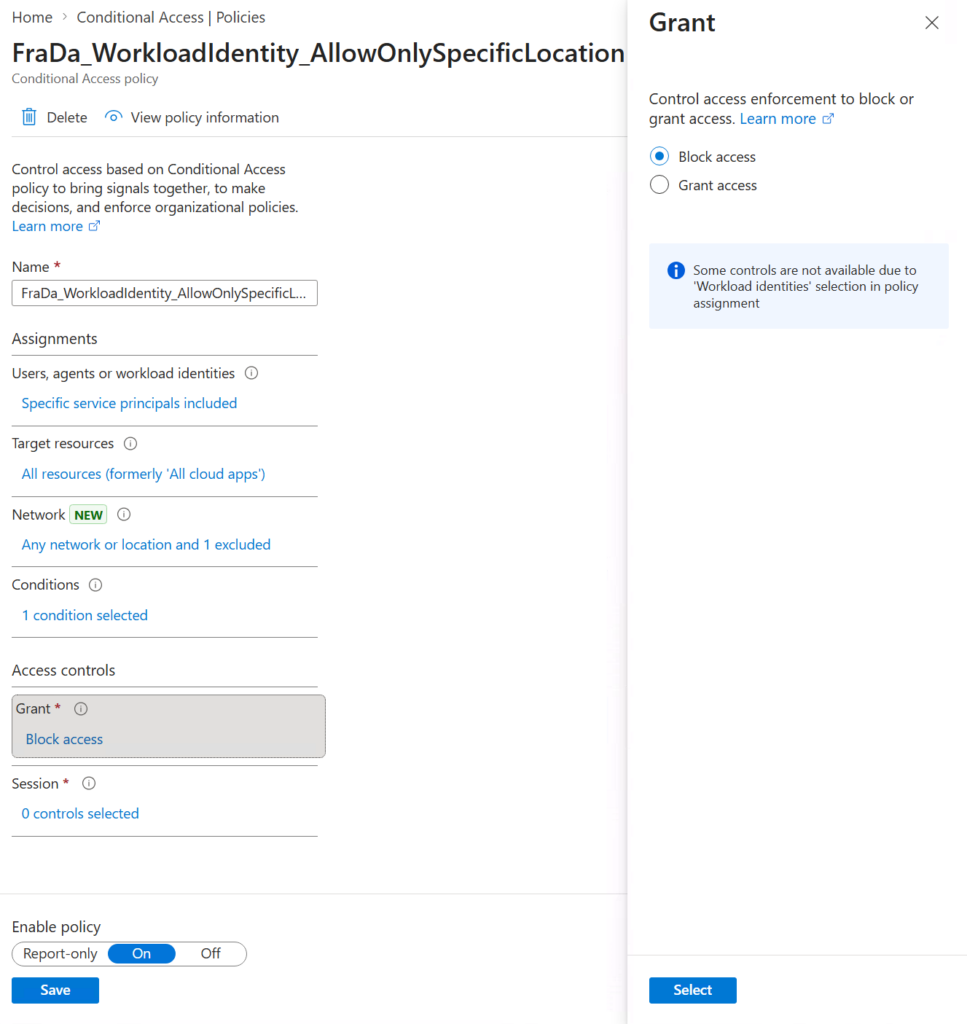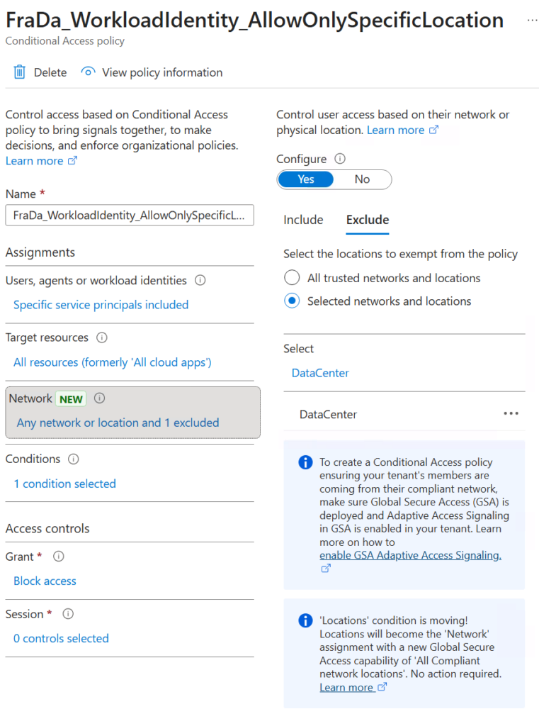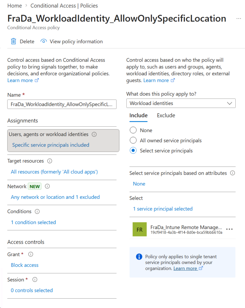 Important: Workload Identity Conditional Access policies apply to authentications within your own tenant only. Multi-tenant applications or external service principals that authenticate from a foreign tenant require a different approach and are not covered by these policies.